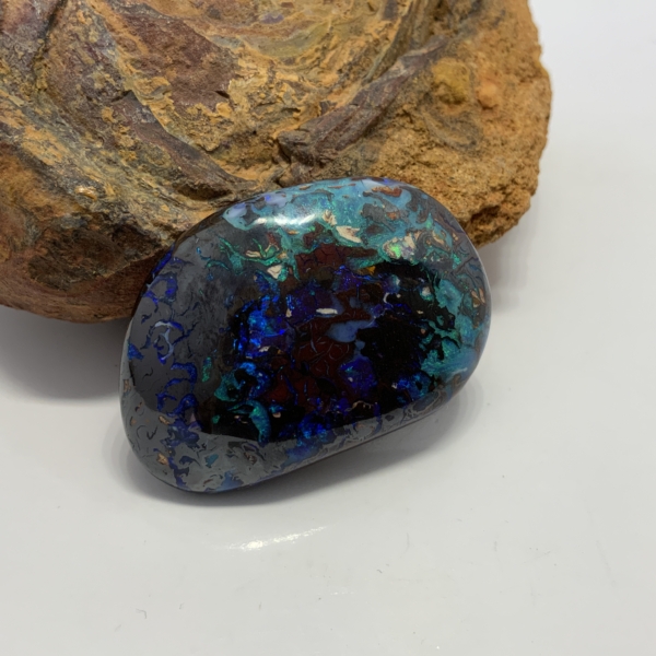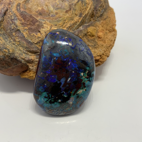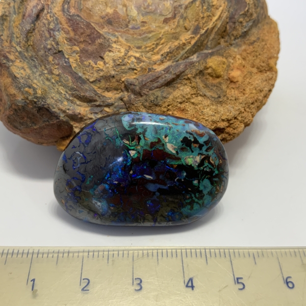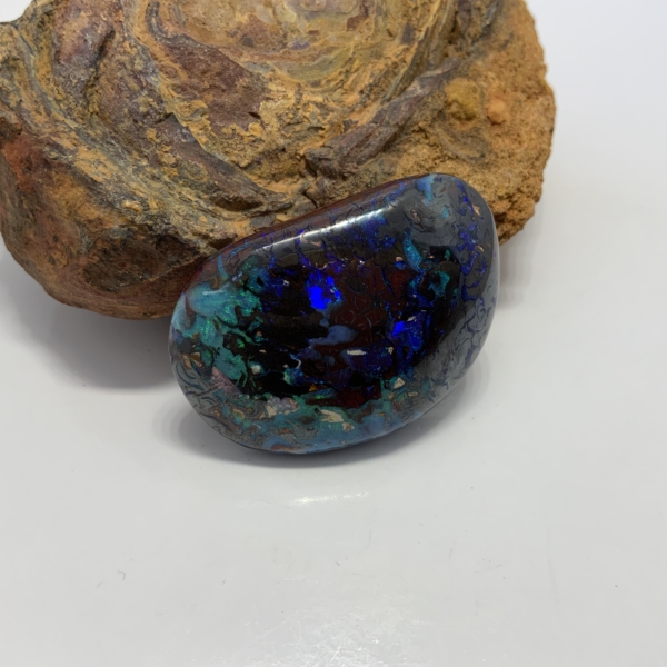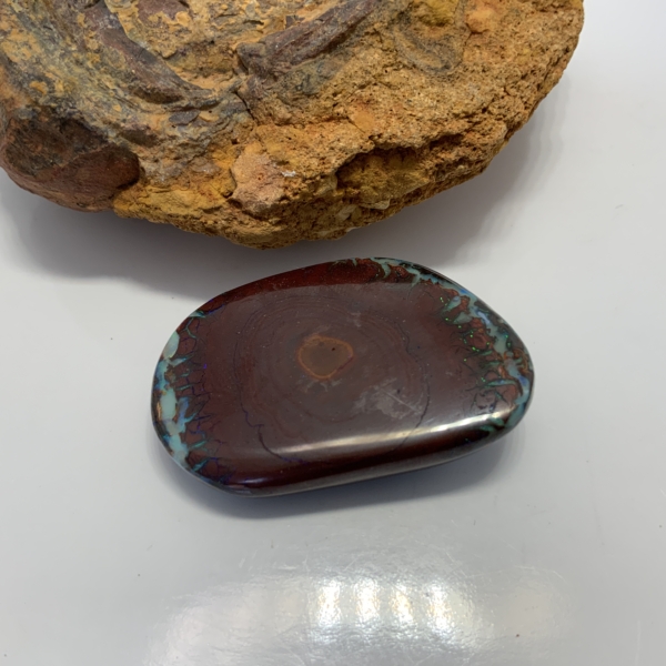 Interesting boulder opal from the Koroit opal field in Queensland. Dark ironstone shows a swirly pattern of turquoise, green and blue colours. Freeform shape 26 x 38mm, thickness 9mm. Weight 65.7carats, 13.14grams. Was $1,700 now $1,360