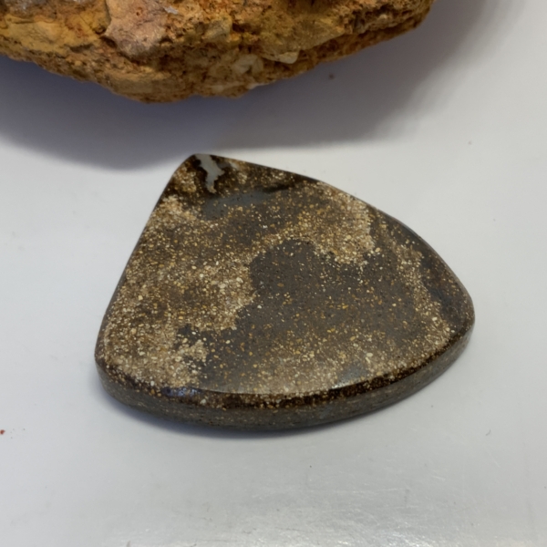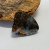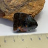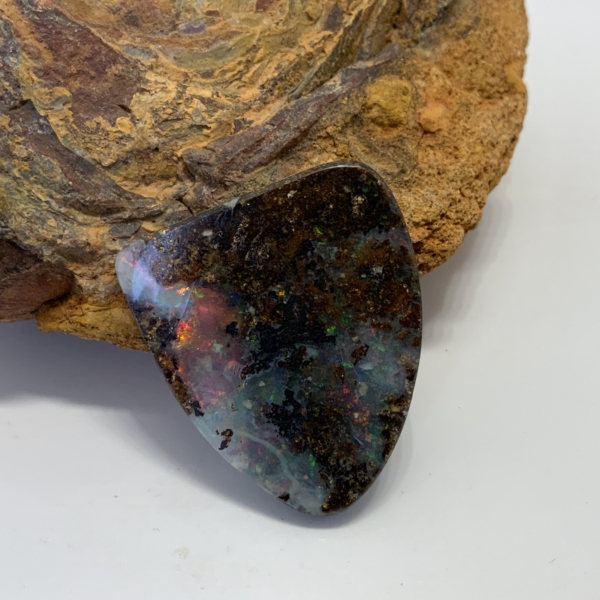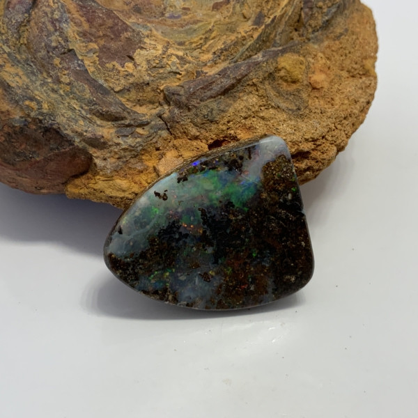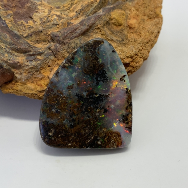 Boulder opal from the Queensland opal fields. The solid opal shows movement of orange, yellow, red and green blue. Freeform shape, width 26mm, length 30mm, thickness 5.4mm. Small crack on the side. Weight 37.5carats, 7.55grams. Was $1,450 now $1,100