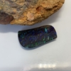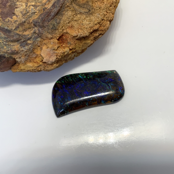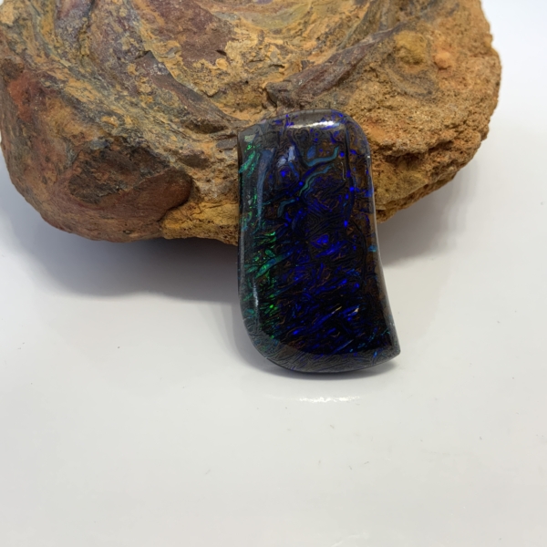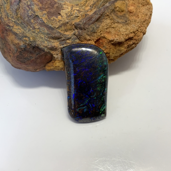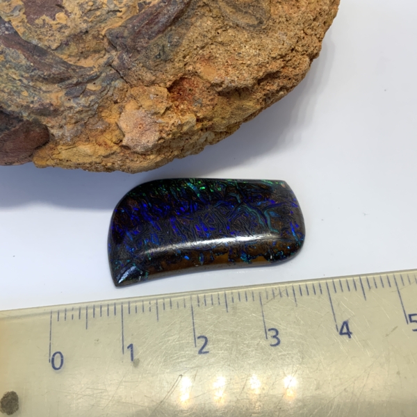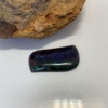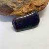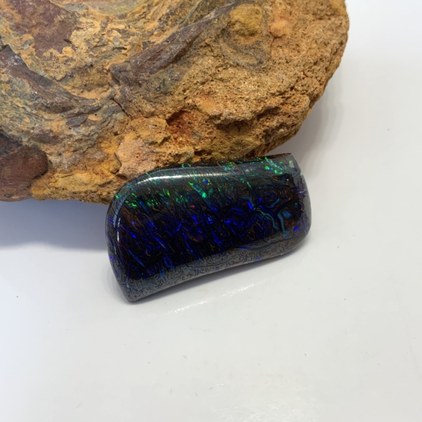 Interesting shape showing colours of dark blue, purple and green in the dark ironstone Boulder opal from the Queensland opal field. Freeform shape – width 15 to 19mm, length 31mm, thickness 4.11mm. Weight 21.55carats, 4.31grams. Was $1,800 now $1,500