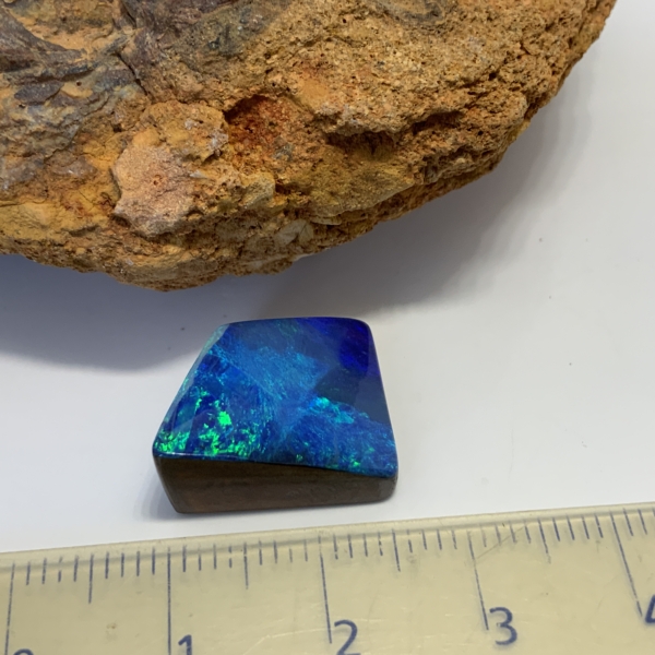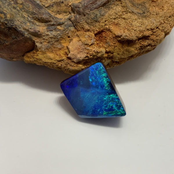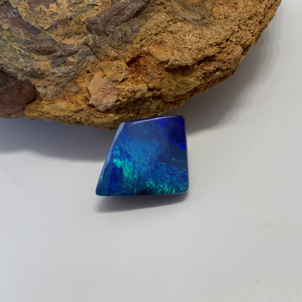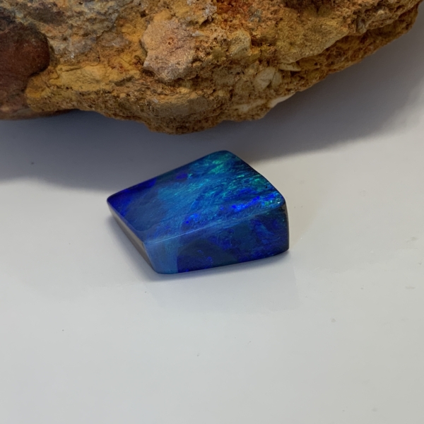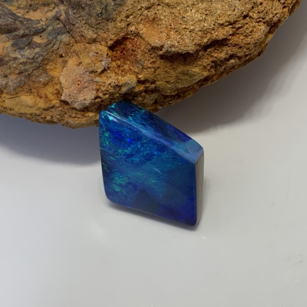 Unusual shaped boulder opal from the Queensland opal field. Blue tones with strong turquoise green. Freeform shape showing colour on the side as well. 12 x 14.5 x 17 x 14mm, side thickness 4.5 to 6.5mm. Weight 15carats, 3grams. Was $3,300 now $2,900