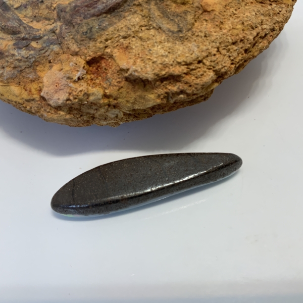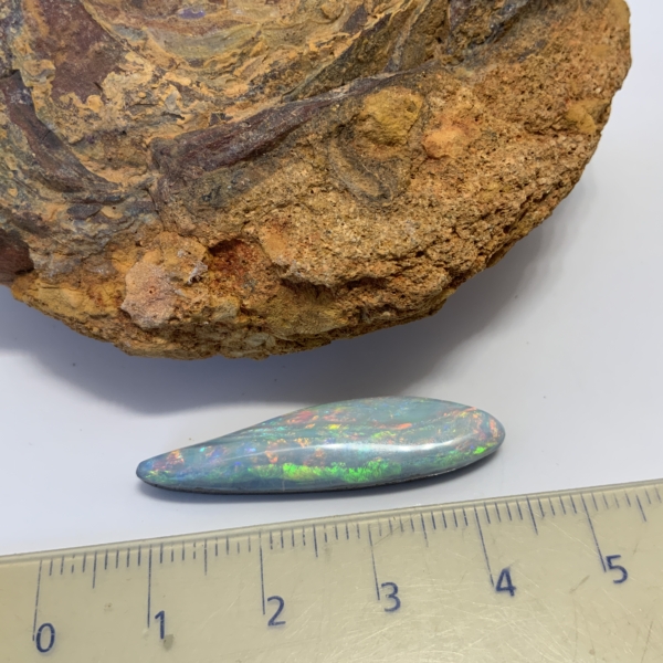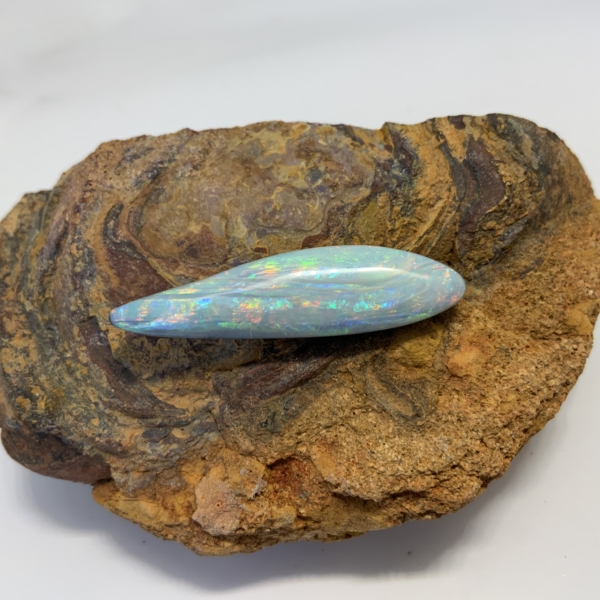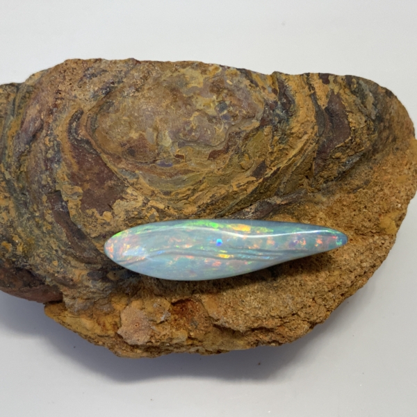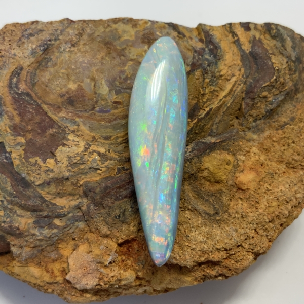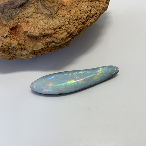 Delicate colours in a long shaped opal from the Queensland opal field. Soft light blue, green, orange, red, yellow in a clean face. Freeform shape width 9.15mm, length 36mm, thickness 5.39mm. Weight 12carats, 2.4grams. Was $1,900 now $1,600