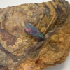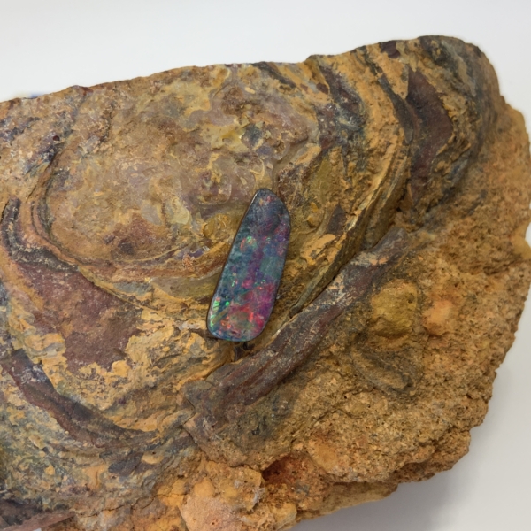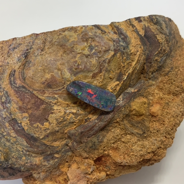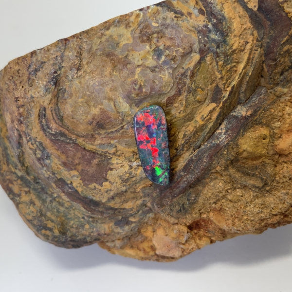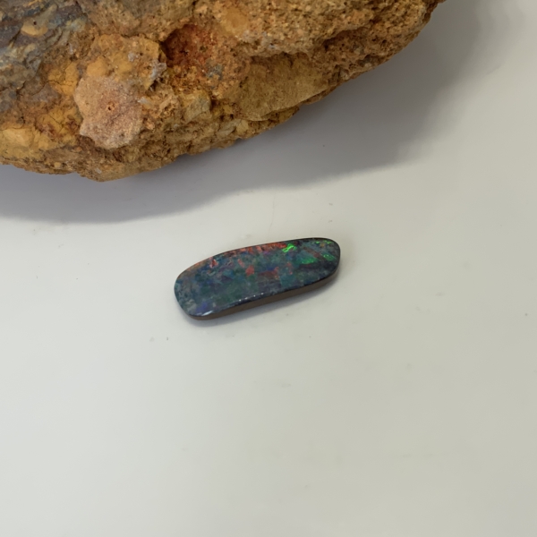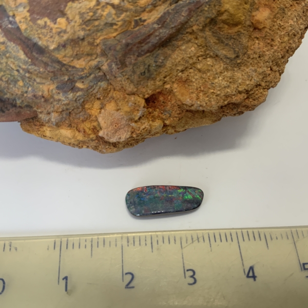 Vibrant red flashes mixed with green and blue in a small boulder opal from the Queensland opal field. Freeform shape, width 5.52mm, length 14.22mm, thickness 2.54mm. Weight 1.8carats, .35grams. Was $1,600 now $1,200