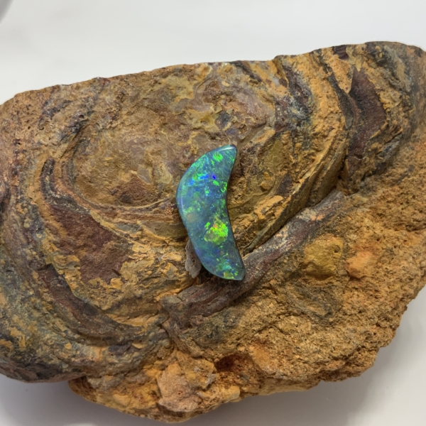 Unusual shaped boulder opal from the Queensland opal field. Showing bright turquoise, green, blue, yellow and orange colours. The freeform shape has a width of 6mm, length 17mm, thickness 3.09mm. Weight 2.85carats, .58grams.