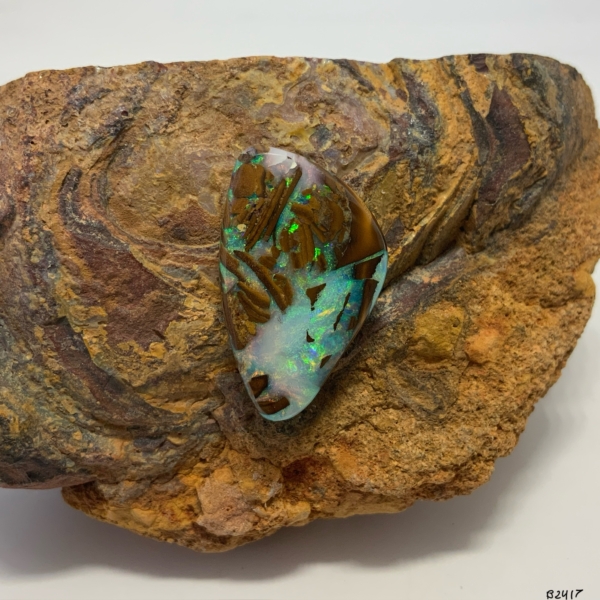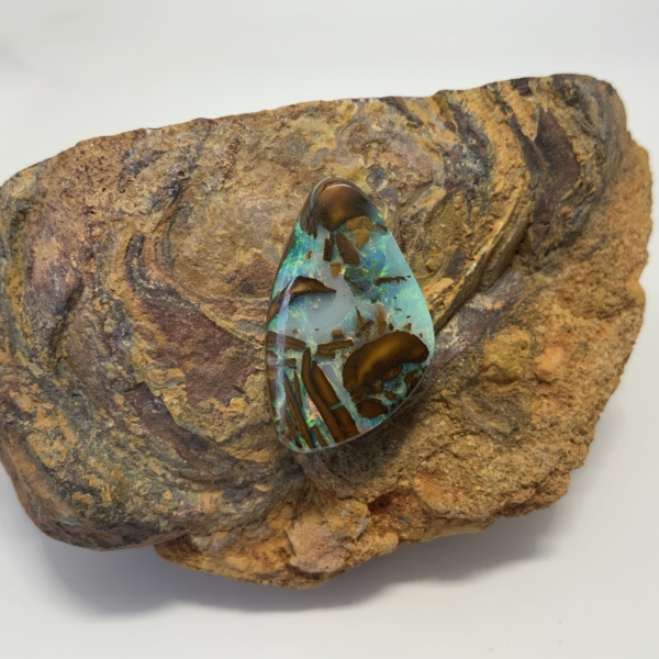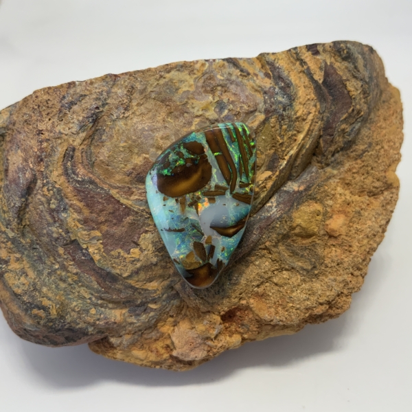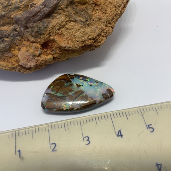 Impressive opalised wood from the Koroit opal field in Queensland. The crystal opal inbetween the ironstone shows light turquoise, green, blue, pink, orange and yellow. This double sided nice freeform shape opal measures 24.5 x 18 x 17.5mm, thickness 4.75mm. Weight 12.05carats, 2.41grams. Was $1,600 now $1,300