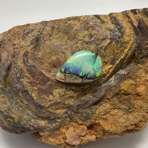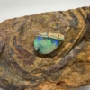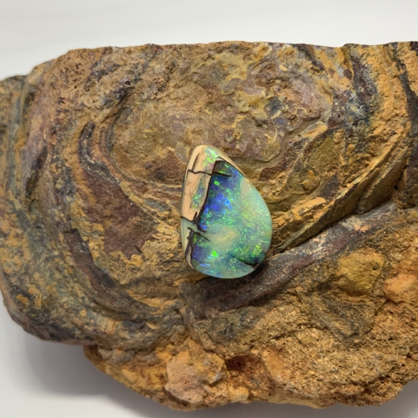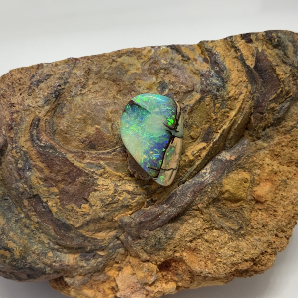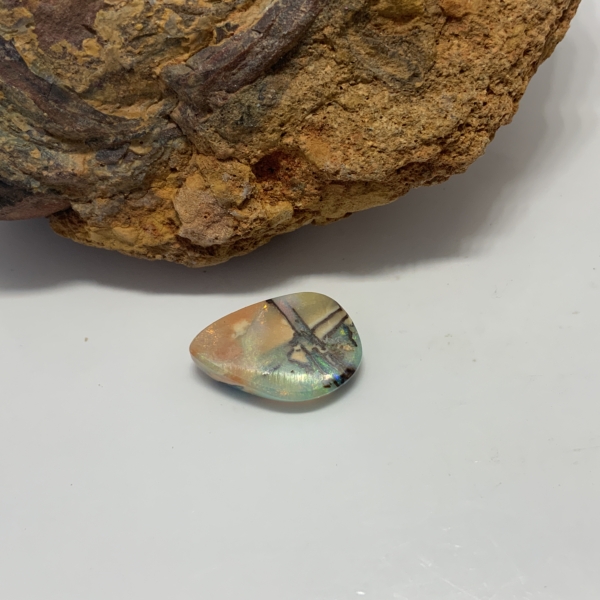 Opalised wood – interesting boulder with crystal opal and boulder lines. Bright turquoise, green, blue and beige colours. Pear shape 11 x 16mm, thickness 4.33mm. Weight 4.35carats, 0.87grams. Was $990 now $800