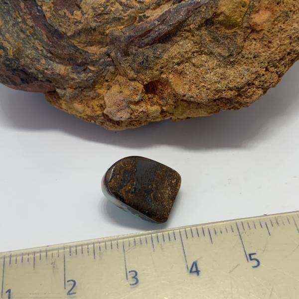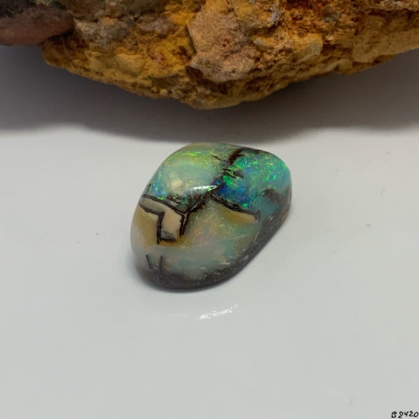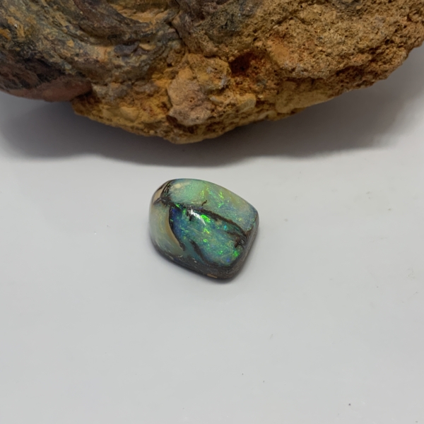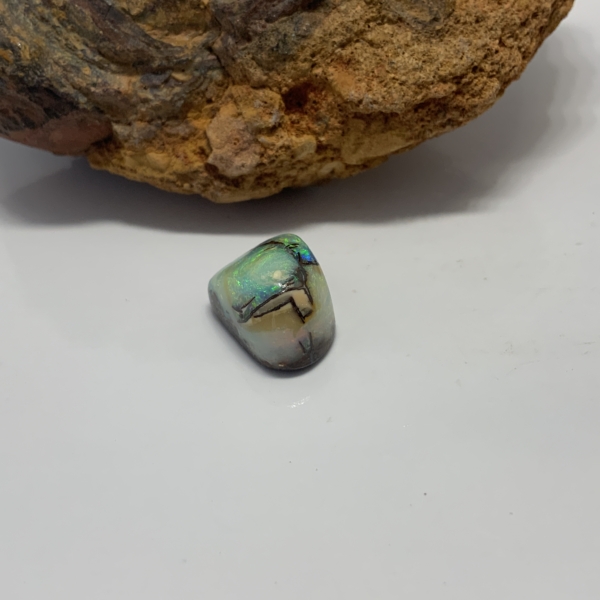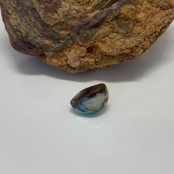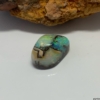 Interesting opalised wood – crystal opal with boulder lines and backing. Turquoise, green, blue and orange in a freeform shape. Height 8.2mm, width 10mm, length 13.65mm, weight 8.3carats, 1.66grams. Was $1,100 now $890