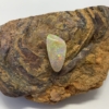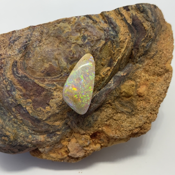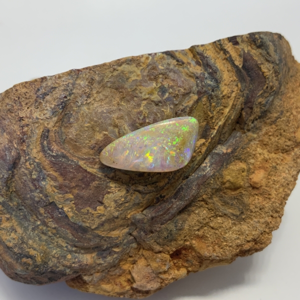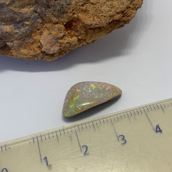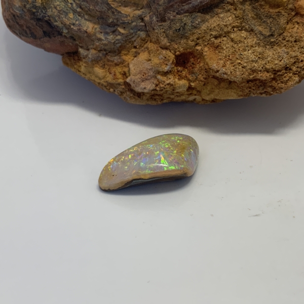 Delicate boulder opal from Queensland opal field. Crystal opal on the dark ironstone. Green, gold, orange and blue colours. Interesting freeform shape. Width 8mm, length 18.5mm, thickness 5.93mm. Weight 6.1carats, 1.22grams. Was $1,150 now $900