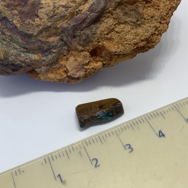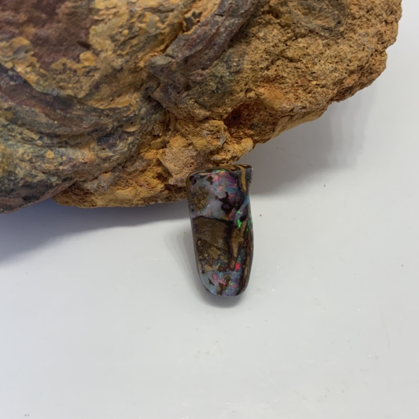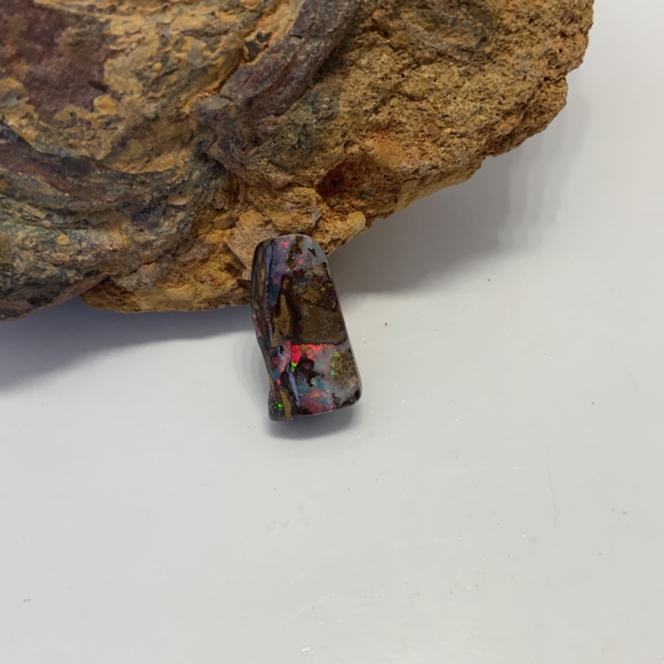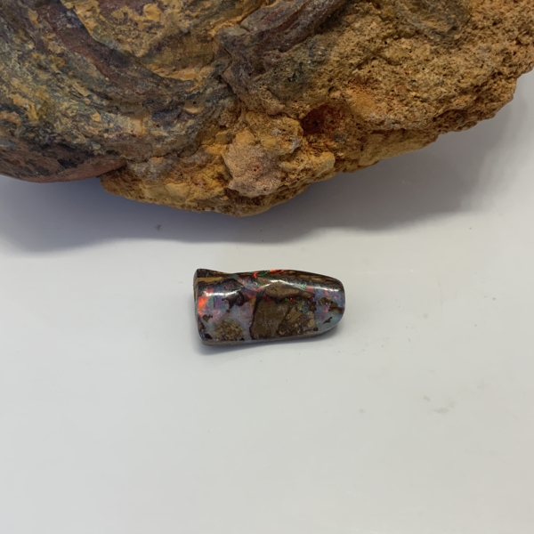 Interesting shaped boulder opal from the Queensland opal field. Red, green, orange flashes in light and dark ironstone. Freeform shape. Width 7.6mm, length 14.24mm, thickness 4.57mm. Weight 3.7carats, .74grams. Was $450 now $360
