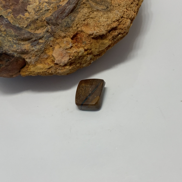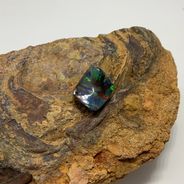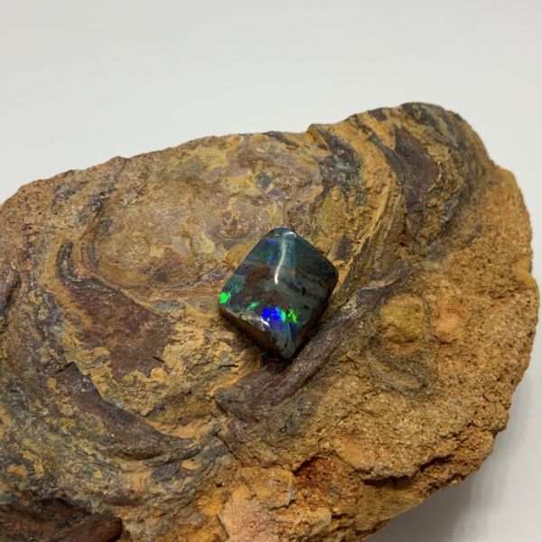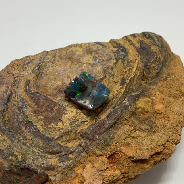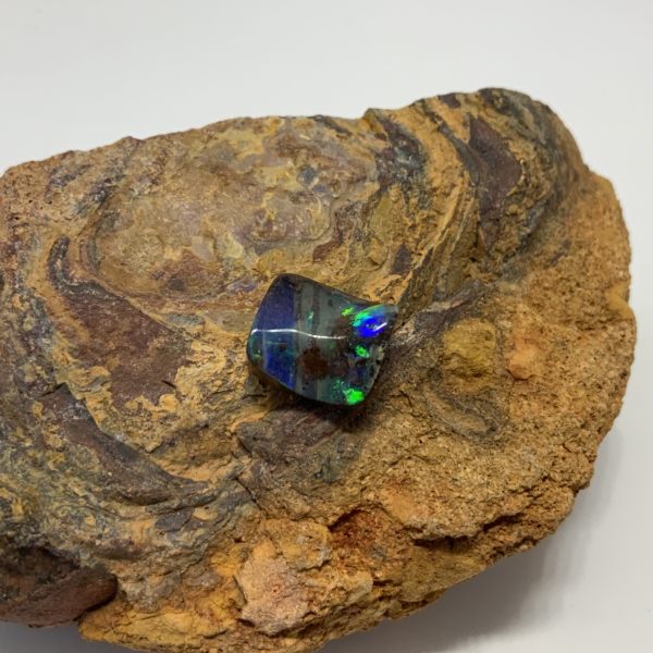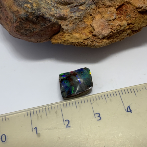 Unusual shape in this boulder opal from the Queensland opal field. Showing blue green flashes, with a little red in the ironstone. Width 9.86mm, length 10.9mm, thickness 3.3 to 5.8mm. Weight 5.4carats, 1.08grams. Was $700 now $550