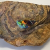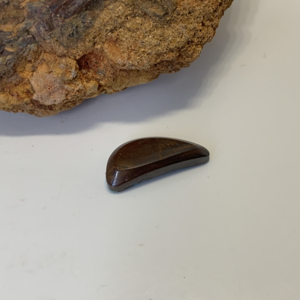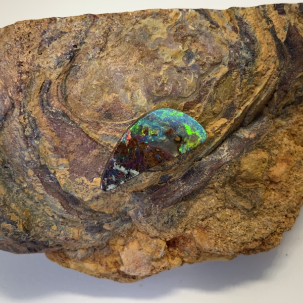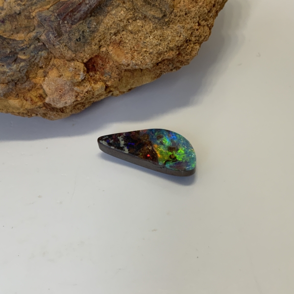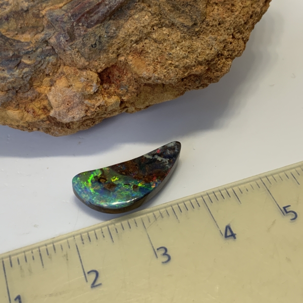 Attractive boulder opal from the Queensland opal field showing green, red, orange, yellow and blue colours. Freeform shape. Width 8.07mm, length 18.31mm, thickness 3.76mm. Weight 5carats(1gram) Was $950 now $750