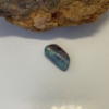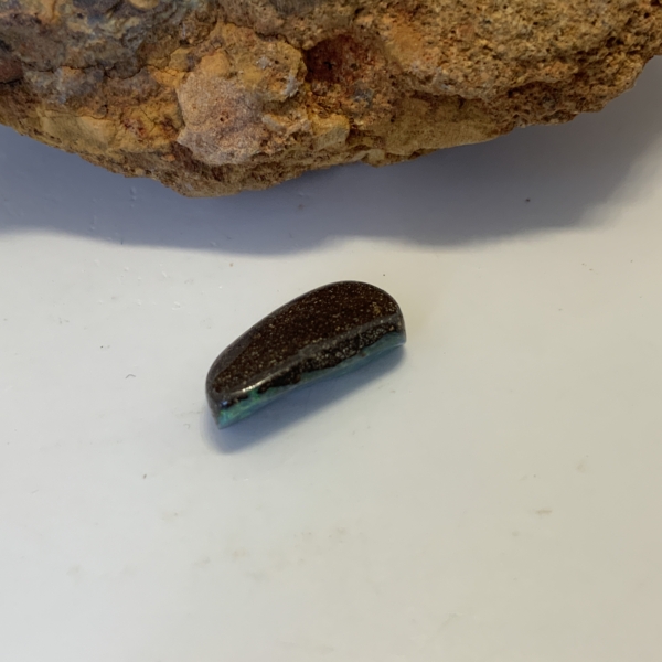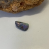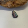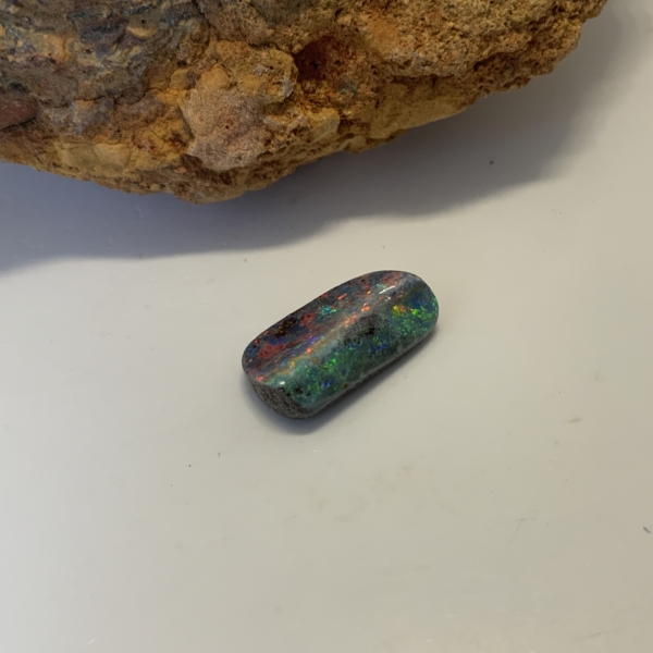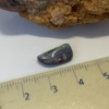 Interesting shaped boulder opal from the Queensland opal field. One side turquoise, blue and green. The other showing red, orange, yellow, blue and green. Length 14.12mm, width 7.58mm, thickness 4.37mm. Weight 3.7carats, 0.74grams. Was $950 now $750
