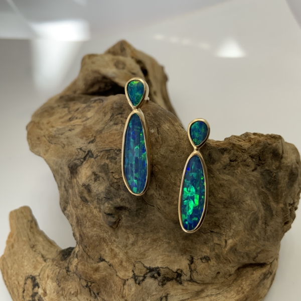 Attractive long earrings (matches pendant J0532) with opal doublets in blue green colours. A doublet is a light opal enhanced by a dark backing. We recommend this item not be immersed in water for prolonged periods. The earrings are a long freeform shape 6mm, length 18mm with a drop shape above 3.5 x 5mm. Weight of the doublets 4 and .6 carats (together 4.6carats). The stud pin is behind the top opal. Width 7mm, length 27mm. Bezel set in 9karat yellow gold. Weight 3.86grams