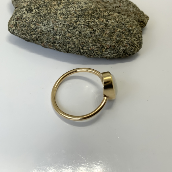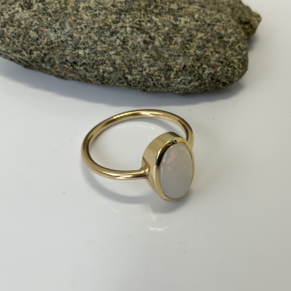 Simple ring design – beautiful finished light Coober Pedy opal from South Australia. Oval shaped 7 x 12.5mm, thickness 3.5mm. 2.5 carats and soft red, orange, blue, green colours in a pinfire pattern. Bezel set in 9karat yellow gold with a 1.7mm round band. Size Q. Weight 2.87grams.