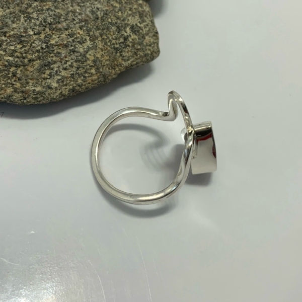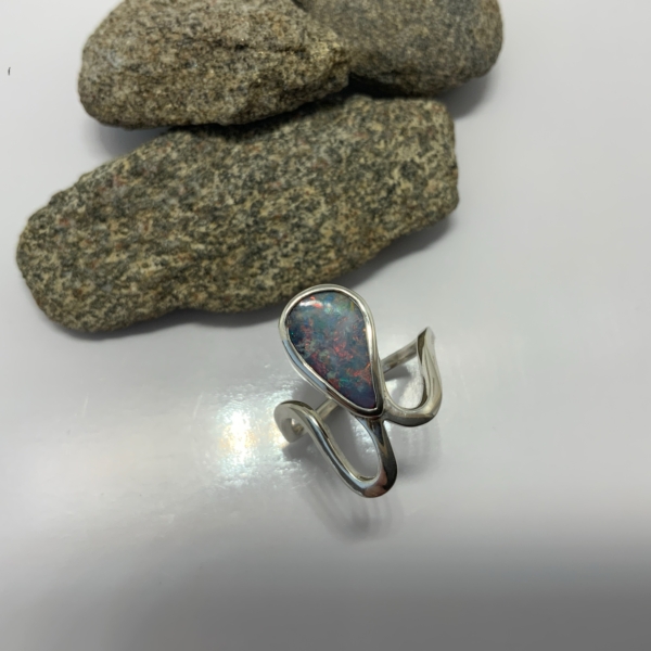 Interesting ring design for a Queensland boulder opal. The solid opal has soft pink, blue, little green and yellow colours in a freeform drop shape. Measuring 7.5 x 12.5mm, 2.75 carats. The snake design is in a sterling silver setting. Size N 1/2. Weight 3.86grams. Was $990 now $850