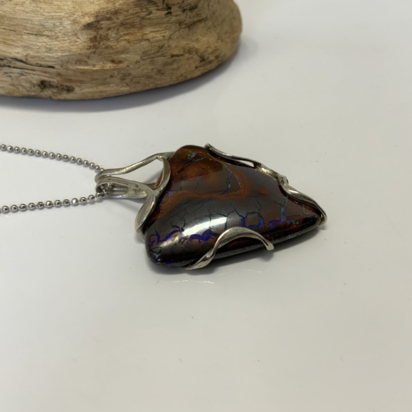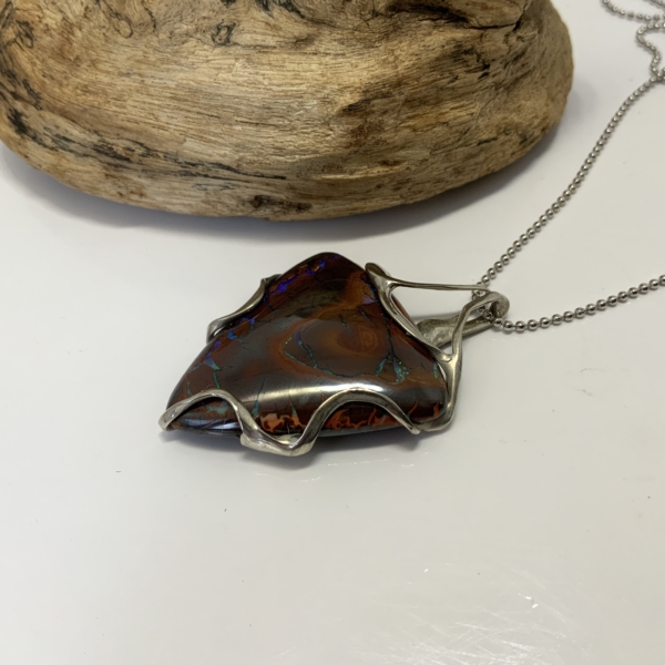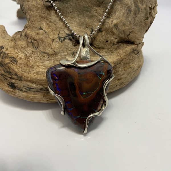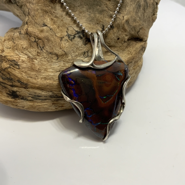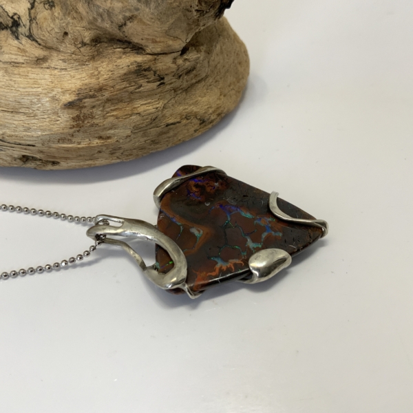 “Twisted Gem Collection”. Solid boulder opal from the Koroit field in Queensland. Dark and light ironstone showing blue, green colour. Freeform triangle 29 x 30mm set in silver wire, double sided pendant width 30mm, length 45mm. Weight 8.87grams. Was $700 now $560