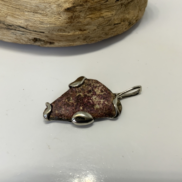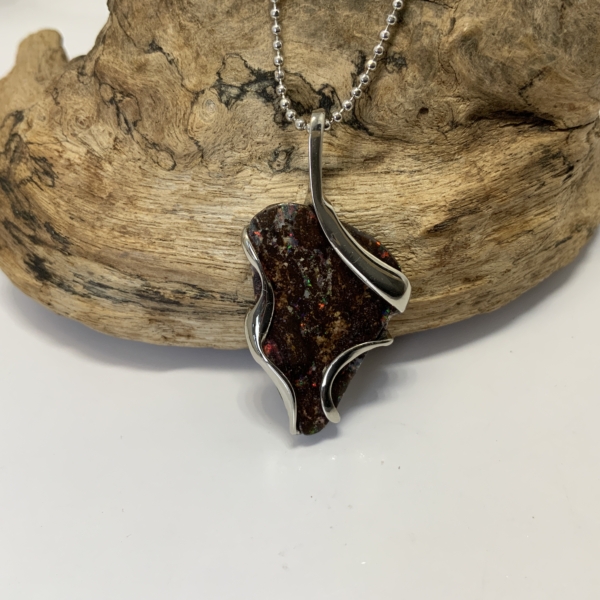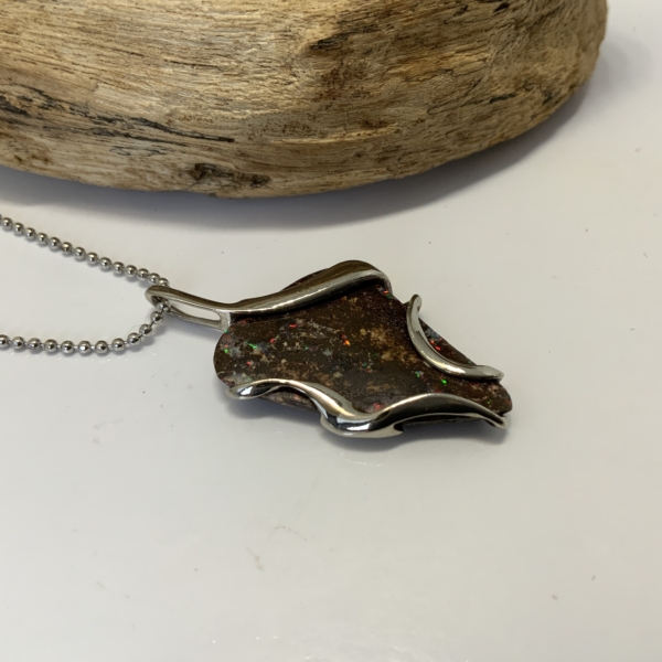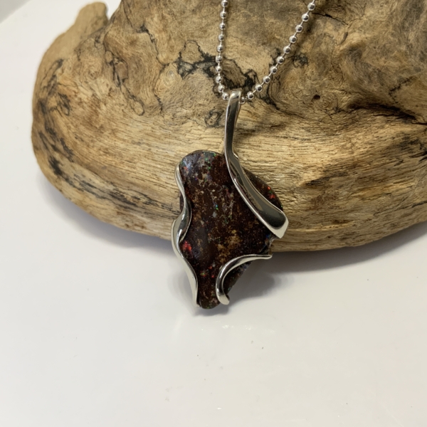 “Twisted Gem Collection” . Solid boulder opal from the Koroit field in Queensland. Dark ironstone showing bright red, green, orange sparkles. Freeform shape 17 x 26mm. Set in silver wire. Pendant width 19mm, length 34mm. Weight 2.32grams. Was $300 now $240