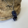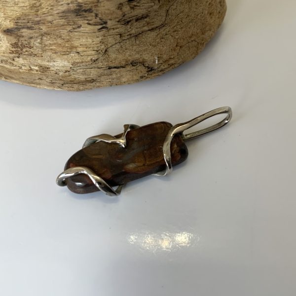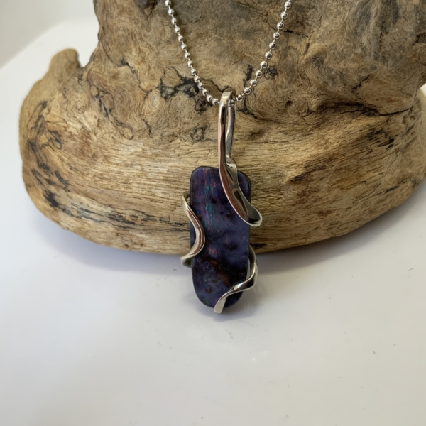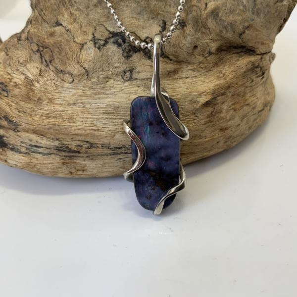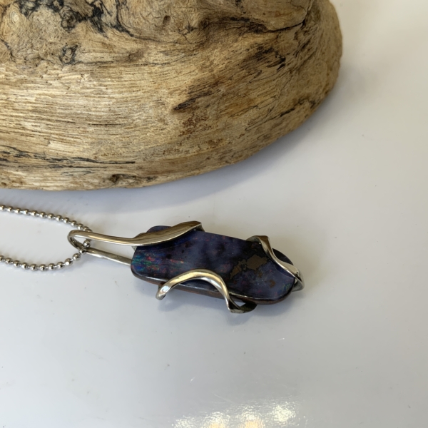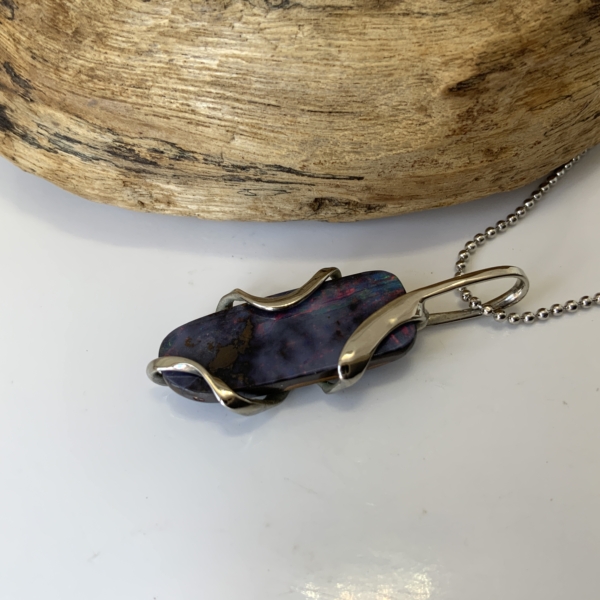 “Twisted Gem Collection”. Solid boulder opal from the Queensland opal fields. Grey blue background shows bright red and green tones. Freeform shape 10 x 24mm. Set in silver wire. Pendant width 23mm, length 37mm. Weight 2.98grams. Was $400 now $320