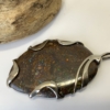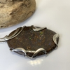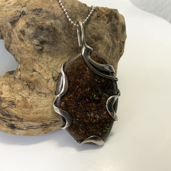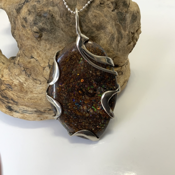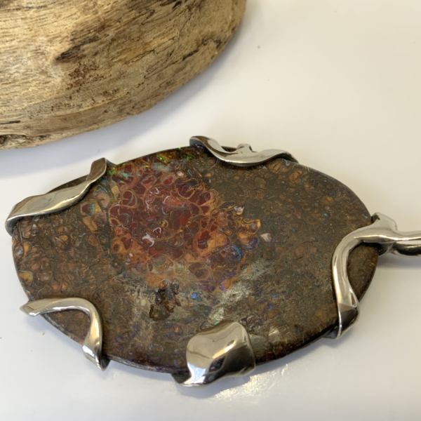 “Twisted Gem Collection”. Large boulder opal from the Koroit opal field in Queensland. Lots of colourful sparkles in the dark ironstone. Red, orange, yellow, green and blue in a swirly pattern. Freeform shape 34 x 49mm. Set in silver wire. Pendant width 36mm, length 64mm. Weight 14.97grams. Was $1,300 now $1,040