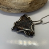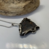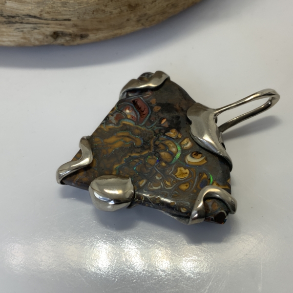 “Twisted Gem Collection”. Interesting boulder opal pendant from the Koroit opal field. Triangle shape 35 x 31mm. Dark ironstone showing swirls of red, blue, green and yellow colours. Silver wire setting. Width of the pendant 35mm, length 43mm. Weight 9.84grams. Was $400 now $320