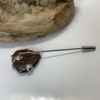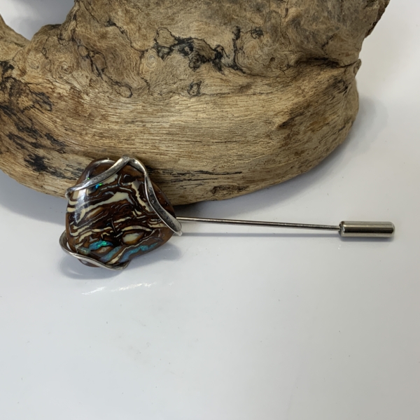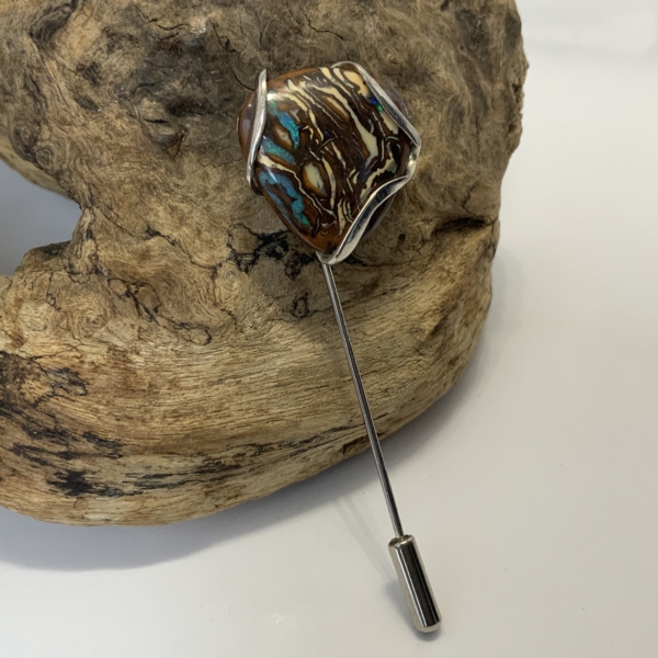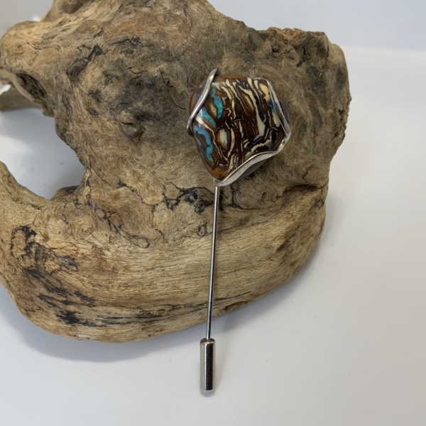 “Twisted Gem Collection”. Stickpin with an interesting boulder opal from the Koroit opal field in Queensland. Light and dark ironstone mixed with turquoise, green, blue and a little orange. Freeform shape 20 x 20mm. Silver wire setting. Stickpin width 22mm, length 63mm. Weight 4.42grams. Was $380 now $300