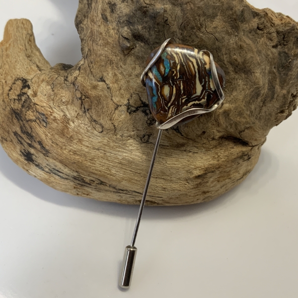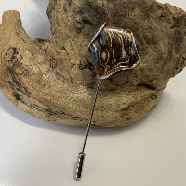 “Twisted Gem Collection”. Stickpin with an interesting boulder opal from the Koroit opal field in Queensland. Light and dark ironstone mixed with turquoise, green, blue and a little orange. Freeform shape 20 x 20mm. Silver wire setting. Stickpin width 22mm, length 63mm. Weight 4.42grams. Was $380 now $300