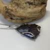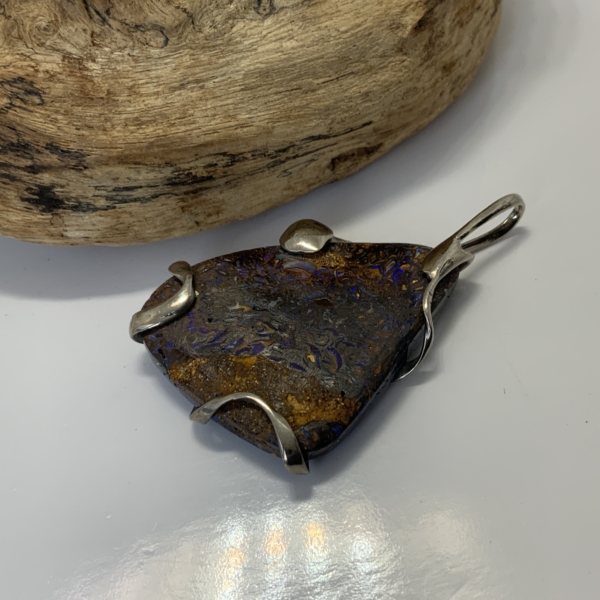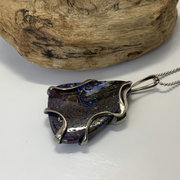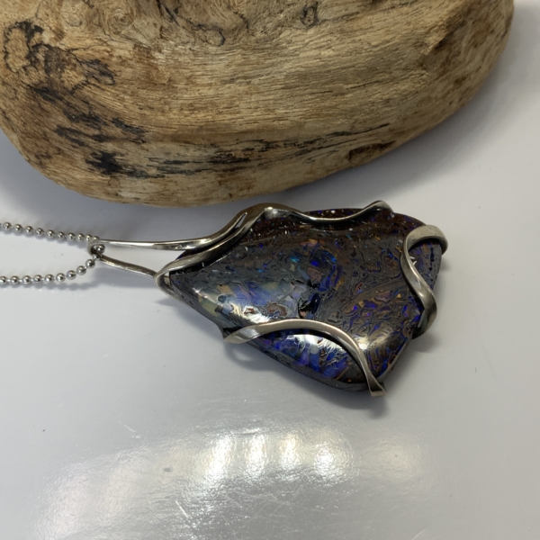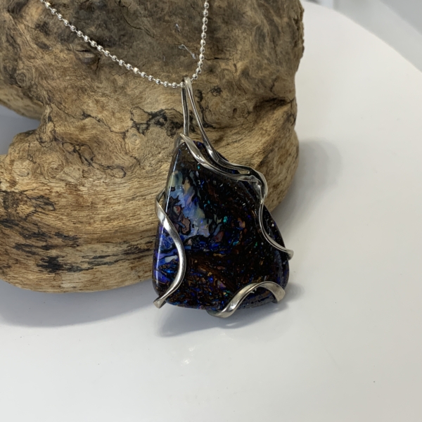 “Twisted Gem Collection”. Solid boulder opal pendant from the Koroit opal field in Queensland. Dark ironstone with blue, green and light blue centre – small fault in the light blue. Freeform shape 27 x 35mm. Silver wire setting. Pendant width 27mm, length 47mm. Weight 9.45grams. Was $600 now $420