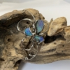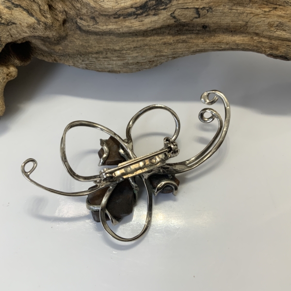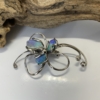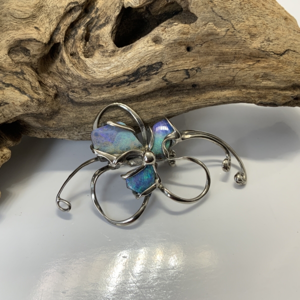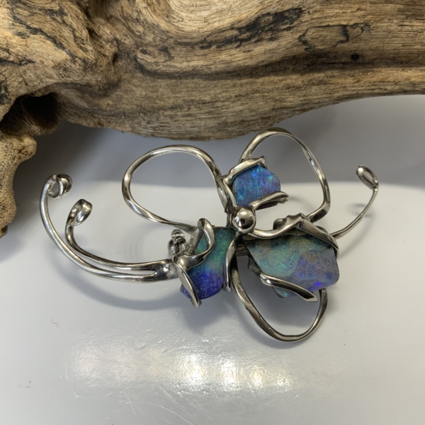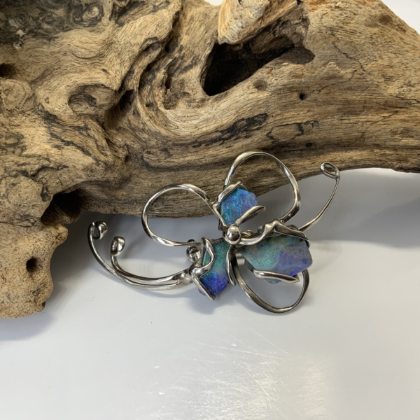 “Twisted Gem Collection”. Beautiful brooch with boulder opal from the Queensland opal fields. Turquoise, blue and green colours cut into a freeform shapes 8 x 7mm, 7 x 10mm, 10 x 15mm. Silver wire setting. Brooch width 33mm, length 58mm. Weight 6.37grams. Was $500 now $400