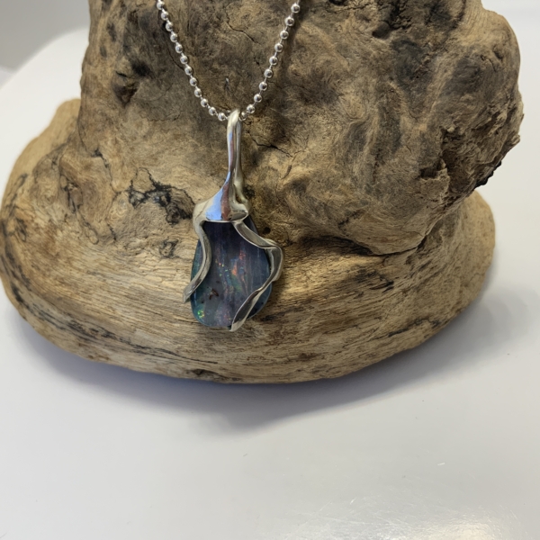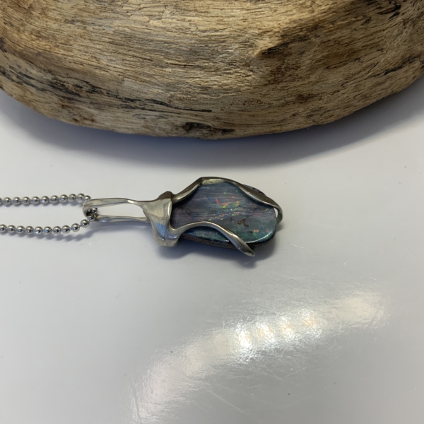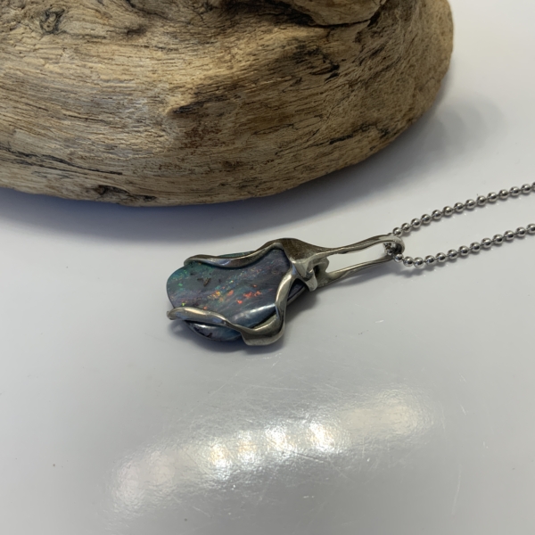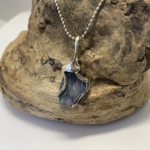“Twisted Gem Collection”. Small pendant with a boulder opal from Queensland opal fields. Light blue, grey base colour with pink, green, yellow and blue. Cut into a freeform shape. Width of the pendant 13mm, length 29mm. Weight 2.07grams. Was $300 now $240
