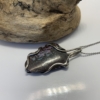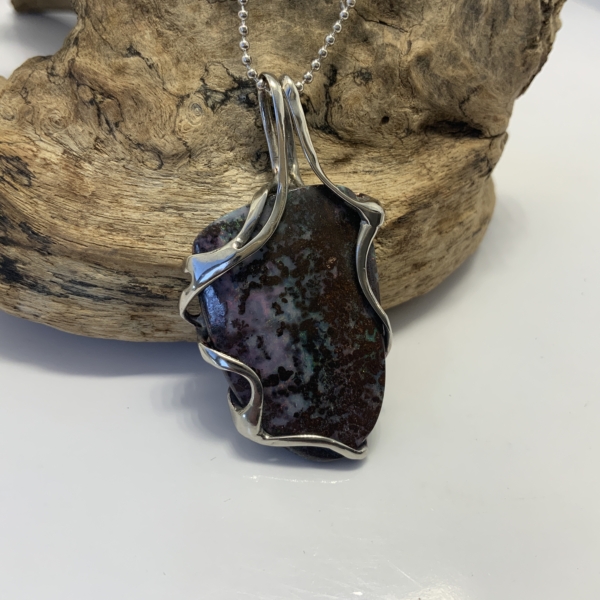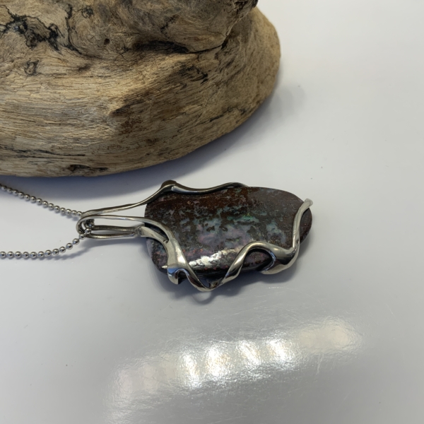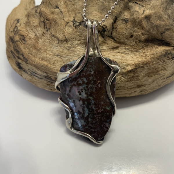 “Twisted Gem Collection”. Large boulder opal pendant from the Queensland opal fields. Dark ironstone showing pink and light green tones. Freeform shape 21 x 30mm. Silver wire setting. Pendant width 25mm, length 45mm. Weight 7.51grams. Was $350 now $280