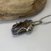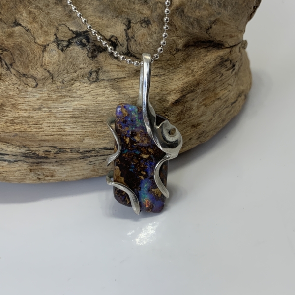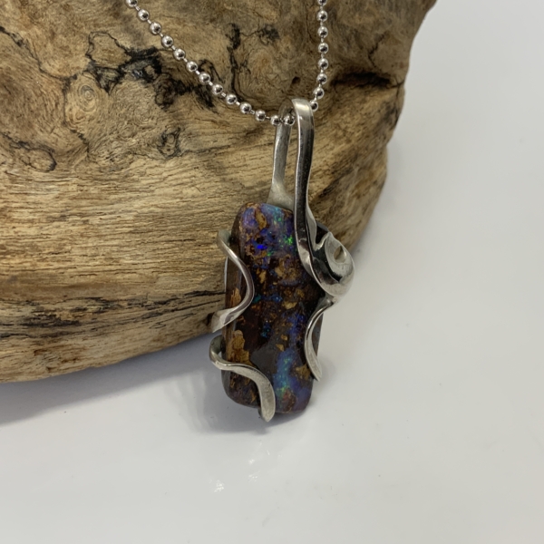 “Twisted Gem Collection”. Boulder opal from the Koroit opal field in Queensland. Light and dark ironstone with light green blue colours. Freeform shape 11 x 22mm. Silver wire setting. Pendant size – width 15mm, length 33mm. Weight 3.79grams. Was $400 now $320