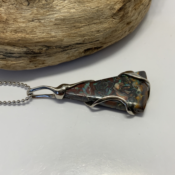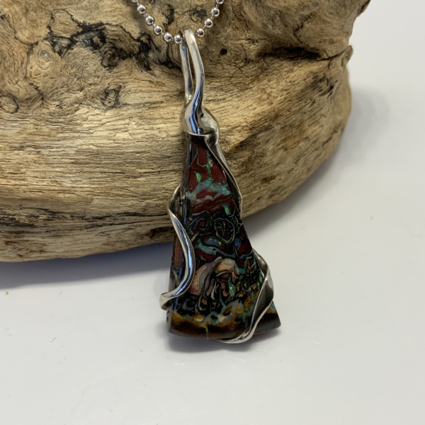 “Twisted Gem Collection”. Boulder opal from the Koroit opal field. Green, pink in light and dark ironstone cut into an interesting shape 15 x 30mm. Silver wire setting. Pendant width 15mm, length 41mm. Weight 3.91grams. Was $300 now $240