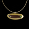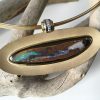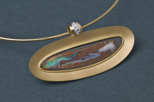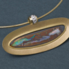 The beautiful ‘Yowah nut’ from Queensland has red, pink, orange, green, blue in-between the ironstone. Long freeform oval shape. Width 55mm, height 13.5mm. The setting frames the boulder from both sides, one has a satin finish with four three point diamonds in the bail, the other side highly polished. Setting in 18kt yellow gold. The pendant height 26m and 67mm wide with the bail adding another 9mm to the height. Weight of piece is 20.1grams. Was $14,500 now $11,500