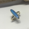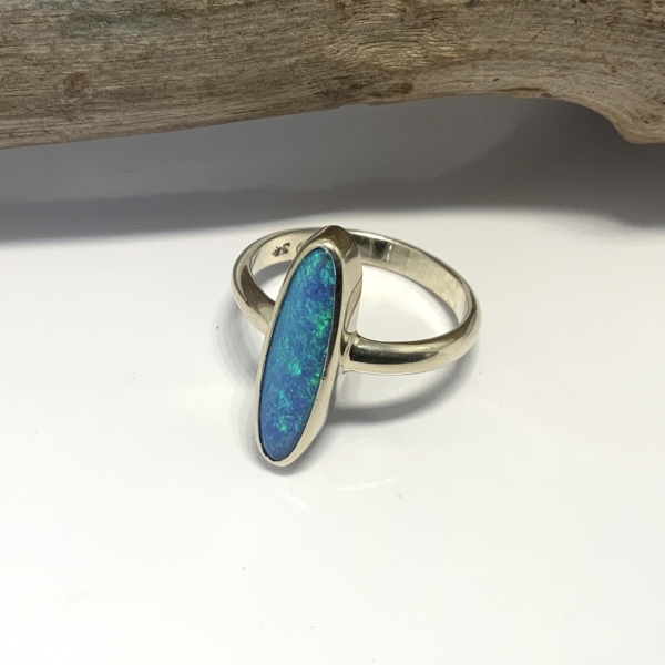 Elegant ring design with a lovely boulder opal. Light blue with turquoise and green in a long oval shape (4 x 18.5mm). Bezel set in 9Karat white gold with a half round band. Width 2.83mm. Weight 4.05 grams. Size N 1/2