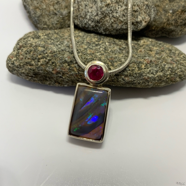Dazzling colour play in this beautiful opal pendant. A Lightning Ridge opal; dark crystal with blue and green flashes in a rectangle shape 9 x 14mm and 4.1carats. Above the opal sits a .3carat Burmese Ruby. All set in 9karat whitegold. Pendant width 10mm, length 21mm. Weight 3.88grams. Was $1,750 now $1,490